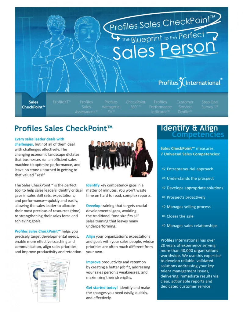 Profiles Sales CheckPoint™ helps you precisely target developmental needs, enable more effective coaching and communication, align sales priorities, and improve productivity and retention.